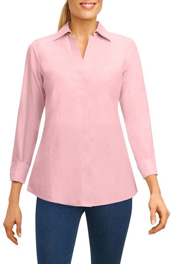 Elevate your wardrobe with the Foxcroft Taylor Essential Shirt. This non-iron chambray in pink offers a polished look with a feminine neckline, perfect for work or social events. Features three-quarter sleeves and elegant shell buttons. 102278